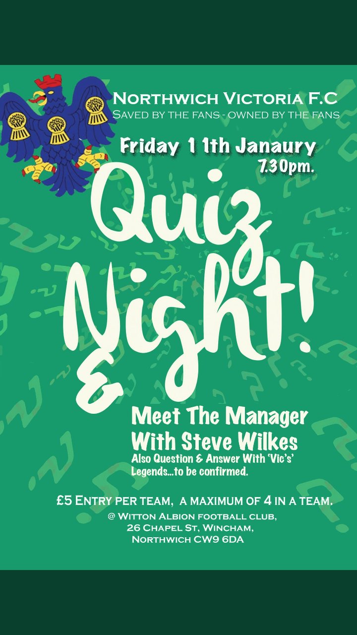 Northwich Victoria FC are holding a fun General Knowledge Quiz Night at the Witton Club on Friday 11th January 2019 starting at 7.30pm . Entry is only £5 per team (maximum number of 4 people each team) , so bring your friends and relatives and see who comes out as Brain of Northwich !